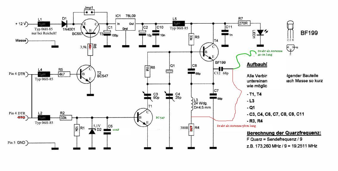 Im Schaltplan hab ich noch einen Draht (Rot makiert) mit eine Länge von 58 cm im Gehäuse verlegt und auf den Widerstand R4 zurückgekoppelt. Der Draht (Grün makiert) hat eine Länge von 40 cm. Mit diesen beiden Änderungen hab ich eine Reichweite von ca. 10m erreicht weis aber nicht warum war nur ausprobiererrei da ich ja aus der Digitaltechnik komme und nur ein einfacher Energieelektroniker bin. Vielleicht kann es mir ja einer hier erklären.