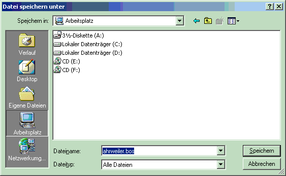 Ändere beim "Speichern unter" den Dateityp auf "alle Dateien" und häng dem Namen ein ".bos" hinten dran, dann funktionierts!