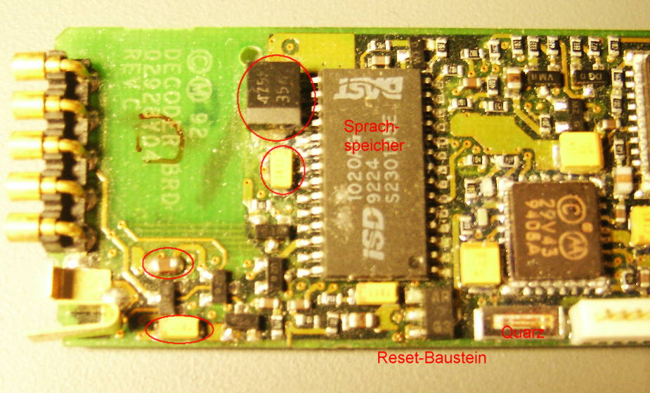 Lasse die im Bild rot umrandeten Bauteile von einem der's kann, überprüfen und nachlöten.
