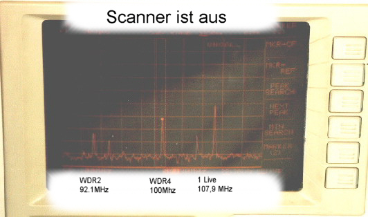 Ich habe einfach mal das Frequenzspektrum um 100MHZ +/- 15Mhz auf meinem S.A. sichtbar gemacht, einmal ohne Scanner im Betrieb, sowie jeweils einmal mit den Scannereinstellungen 65MHZ, 75Mhz und 85MHz (glatt). Die Empfangsantenne (des S.A.) stand unmittelbar neben dem Scanner