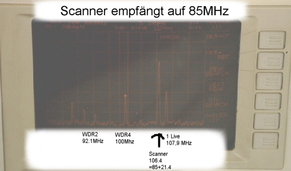 Dabei kann man sehr schön die (Stör-)Abstrahlung des Scanners erkennen, welche sich (bei meinem Scanner...) 21,4 MHz über der Empfangsfrequenz befindet, je nach einstellung also mitten im Radiobereich!!!