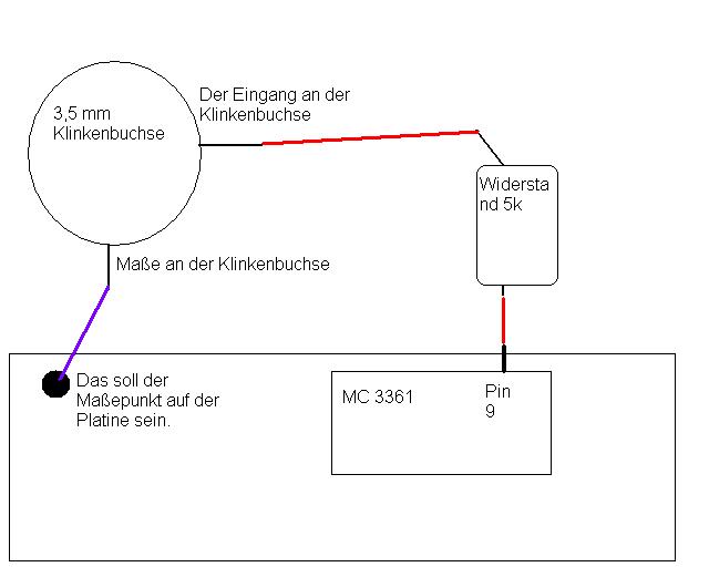 Habe einen UBC 220XLT. Ich löte an den 9. Pin des MC3361 einen 5K Widerstand an und von dem Widerstand dann in die Klinkenbuchse. Von dem Maßepunkt der Klinkenbuchse gehe ich noch auf einen Maßepunkt auf dem Scanner. Sehe ich das richtig.