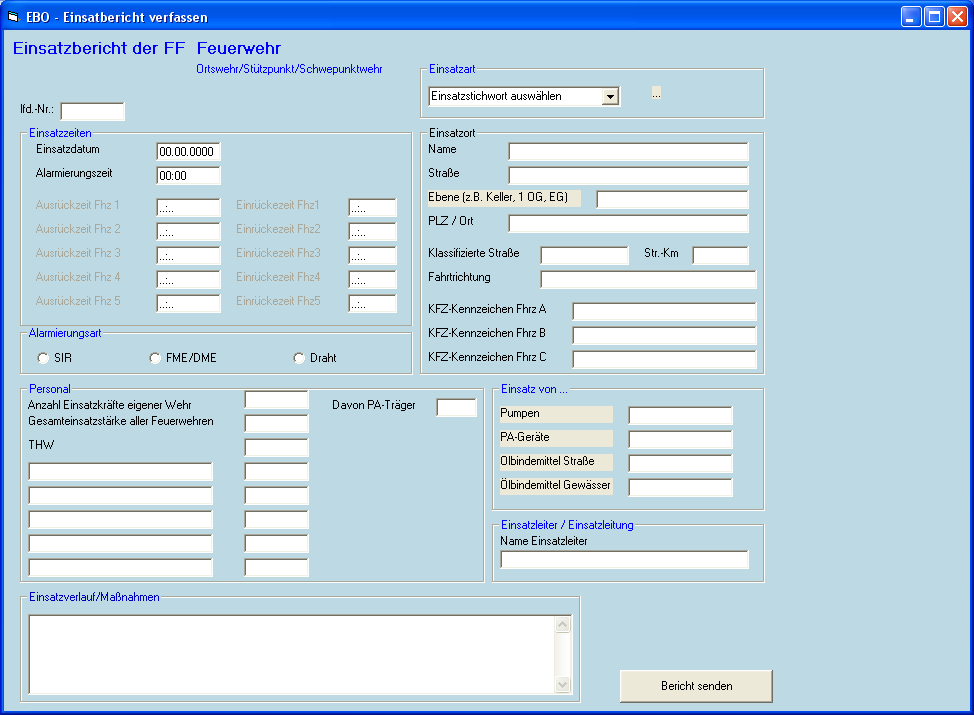 Da ab nächstes Jahr vorgesehen ist das wir unsere Einsatzberichte online per Email schicken können, bin ich am überlegen ob ich für unsere Wehren ein Programm schreibe, wo die Daten die benötigt werden eingetragen werden können und anschließend verschickt werden. Vorteill die Emails sehen Einheitlich aus. Nun meine Frage, welche Infos müssen da rein, da ich nicht aus der Führungriege bin. Möchte auch meiner Führung es nicht vorschlagen das ich sowas machen möchte bis ich nicht eine einigermaßen Lauffähige Version habe.