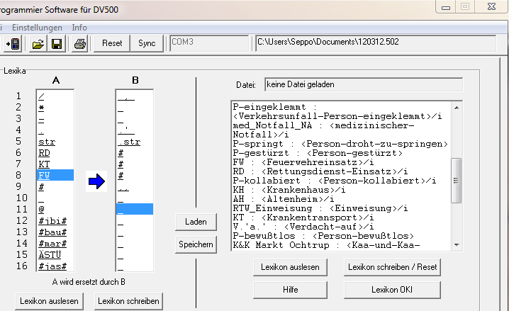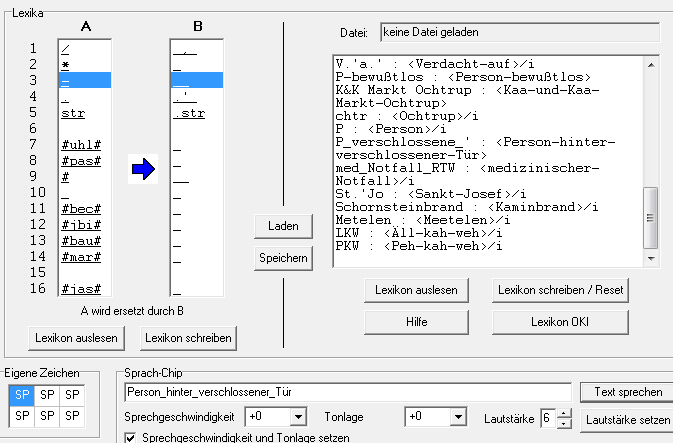 du solltest dir einmal in Ruhe die Hilfe zum Lexikon durchlesen und auch die Bedinungsanleitung zum Sprachprozessor (speziell ab Seite 32, aber auch die Seite 17 stehen schon ein paar interessante Infos..., der Rest vorher ist egal, da das die Ansteuerung ist, welche Swissphone ja übernimmt...)