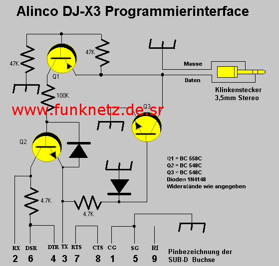 Ich hab den Yaesu VR-120D, den kann man mit dem Kabel für den Alinco DJ-X3 oder dem Kabel für den Yaesu Vr-500 programmieren. Ich hab mir im Internet eine Anleitung gesucht und ein Kabel (was eigentlich für den VR-500 ist) zusammengebastelt. Leider funktioniert das Kabel mti dem VR-120D nicht. Also freut euch nicht zu früh.....