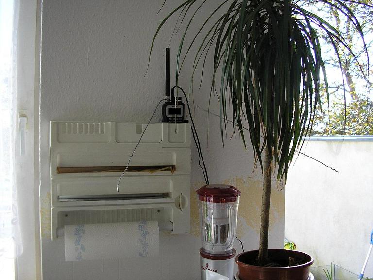 Metallkleiderbügel aufgebogen und mittig um den BNC-Anschluss gewickelt. Die beiden Radialen dann 45° nach unten gebogen und gut ist. Also, wenn noch nen Metallkleiderbügel im Schrank hängt, dann probier das mal aus.