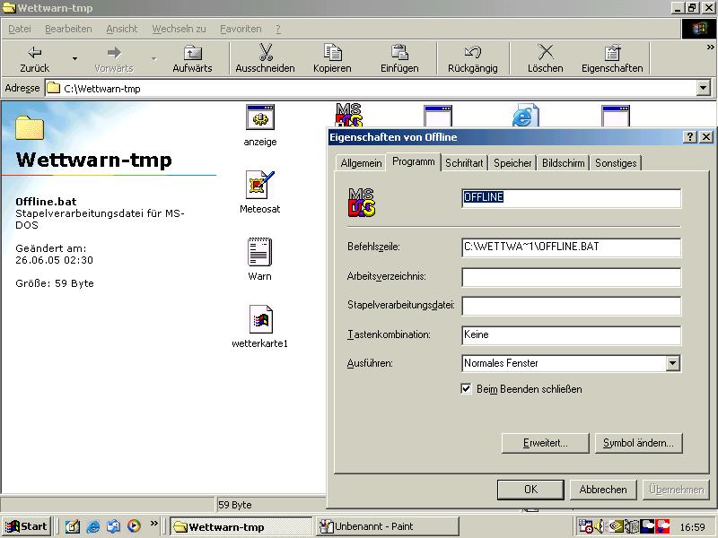 Ich habs gerade mal unter Win98SE getestet. Innerhalb 10 Minuten hatte ich 4 Einträge. Daruf hin hab ich mal was getestet. Ob das der richtige Lösungsweg ist kann ich nicht sagen da ich sonst mit WinXP arbeite und somit nicht im Dauerbetrieb testen kann/möchte. Ich habe bei den *.Bat-Dateien (im Wetterwarn-Tmp-Ordner) die Eigenschaften geändert und beim Reiter Programm bei dem Punkt "Beim beenden Schließen" ein Harken gesetzt. Somit hatte ich nach der gleichen Testzeit nur ein Eintrag. Vielleicht hilft Dir das. Ist nur ne Idee, da Win 98 ja Standartmäßig geöffnete Batchdateien nicht schließt beim beenden. Kannst mich ja auf dem laufenden halten obs funktioniert.