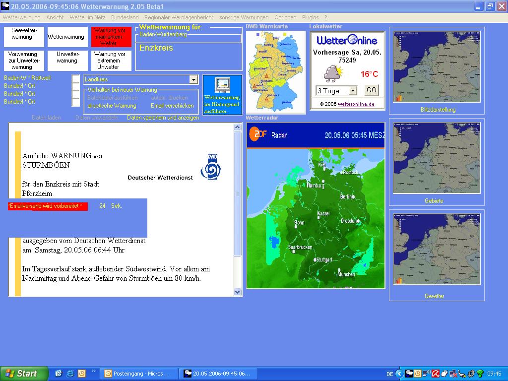 3. Ich lasse das Programm im Hintergrund starten wenn Windows startet. Da kommt ja dann das Fensterchen das Wetterwarnungen gestartet wird aber dann dauert es noch min. 40sec bis überhauptmal die Startmaske(dein schönes Bild) erscheint. Die will ich aber eigentlich auch net sehen wenn ich sage im Hintergrund starten.