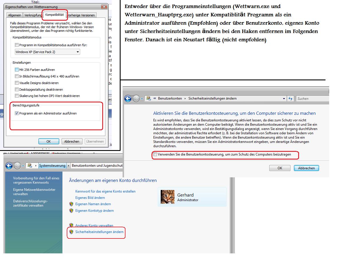 Im Kompatibilitätsmodus kommt man über die Programmeigenschaften (rechter Mausklick auf Datei, dann Eigenschaften, dort dann unter Kompatiblität bei Berechtigungsstufe ein Haken setzen unter "Programm als Administrator ausführen". (In frage kommen die Dateien Wetterwarn.exe und Wetterwarn_Hauptprg.exe) . Die Sicherheitseinstellungen kann man unter Benutzerkonto deaktivieren, siehe dazu auch die Anlage.