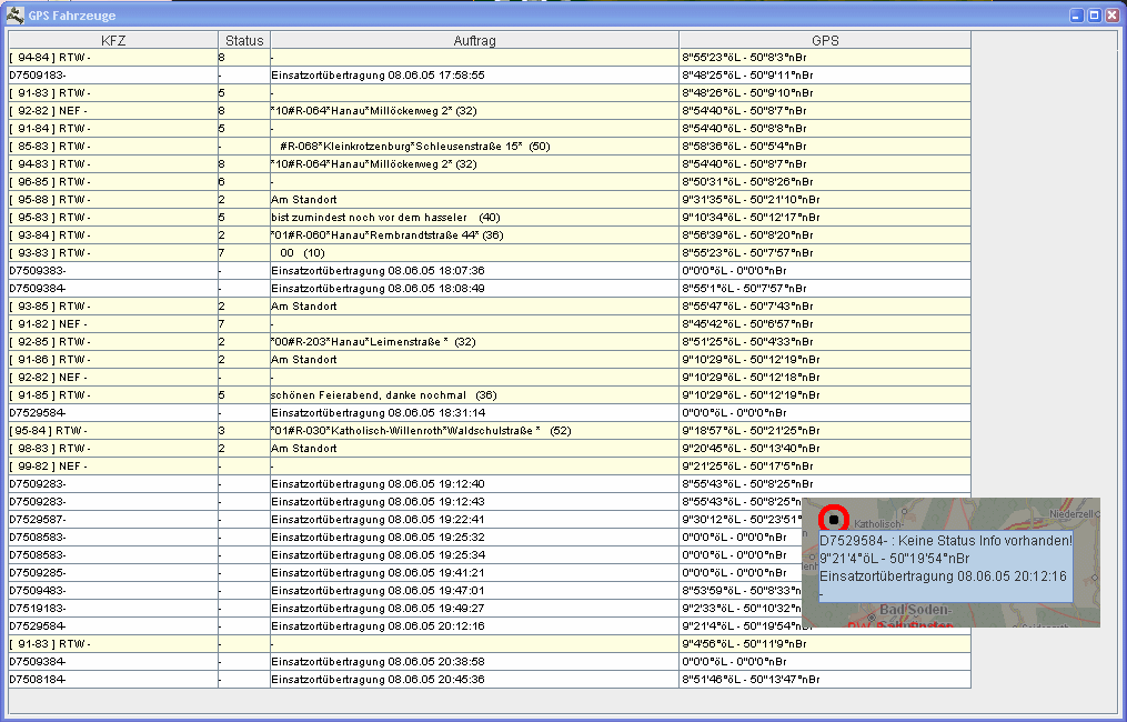 3c.) Wenn ich mit der Maus über ein Zielort fahre, steht die FMS-Kennung da. Eine Umwandlung in den richtigen Fahrzeugnamen fehlt. Weiterhin steht da immer "Einsatzortübertragung..." und nicht der tatsächliche Einsatzauftrag. Das sollte geändert werden. Auch in der Liste "GPS-Fahrzeuge" steht die rohe FMS-Kennung und nur "Einsatzortübertragung" (Siehe Bild)