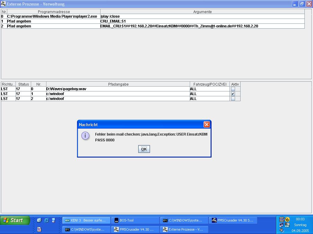 Ich habe nun schon das ganze Forum studiert und sämtliche Mailadressen von verschiedenen Providern wie T-Online, GMX, Web.de und meine eigenen probiert aber ich komme einfach nicht weiter. Es kommt als Fehlermeldung: Fehler beim mail checken:java.lang.Exception:USER.... und Fehler beim EMail senden:java.net.SocketTimeoutException:REad timed out