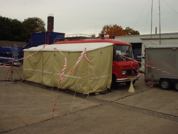 Je nach Einsatzoption sitzt der Führungsstab im Vorzelt. Dafür haben wir für die gesamte Fahrzeuglänge Magnettafeln angefertigt.