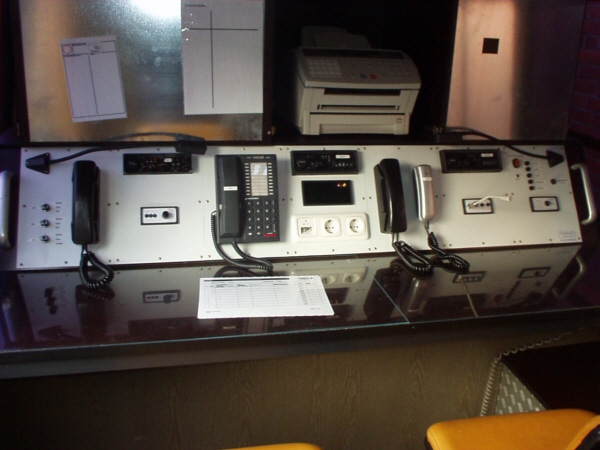 Jeder Platz verfügt über ein Telefon das mit einer kleinen TK-Anlage gekoppelt ist. Als Amt kann zwischen 2 Analogleitungen, ISDN oder Mobilfunkadapter gewählt werden. In der Mitte der beiden Plätze befindet sich ein Laserfaxgerät das ebenfalls über Mobilfunk, analog oder ISDN angesprochen werden kann. Als Besonderheit erfolgt bei dieser Anlage die Einstellung kinderleicht über nur 3 Drehschalter ohne Patchfeld oder notwendigen PC-Programmierung. Es gibt noch viele Detaillösungen die hier den Rahmen sprengen würden.