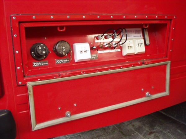Desweiteren verfügt das Auto noch über 2 DECT-Telefone, diverse Anschlussmöglichkeiten, eine 3fach Feldtelefonvermittlung, ein komplett neues 12 und 230 Volt Netz, ein IT-Netzwerk, zusätzliche Zweitbedienung für das vierte Funkgerät (4m), Headsets für Funk und Telefon, usw.