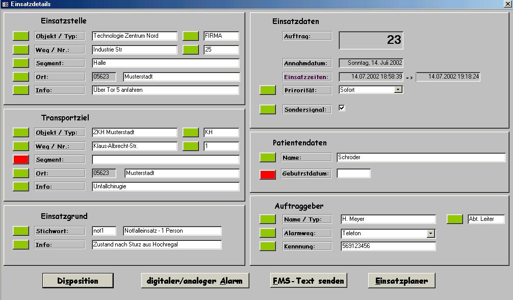 - Ich frage mich ob man neben der Patientendaten zusätzlich noch nen "Auftraggeber" braucht. Ausser vielleicht bei FW-Einsätzen. Aber da könnte man ja einfach ein Feld unter der Überschrift "Anrufer" und dort Name, Meldeweg und Tel.nummer festhalten.