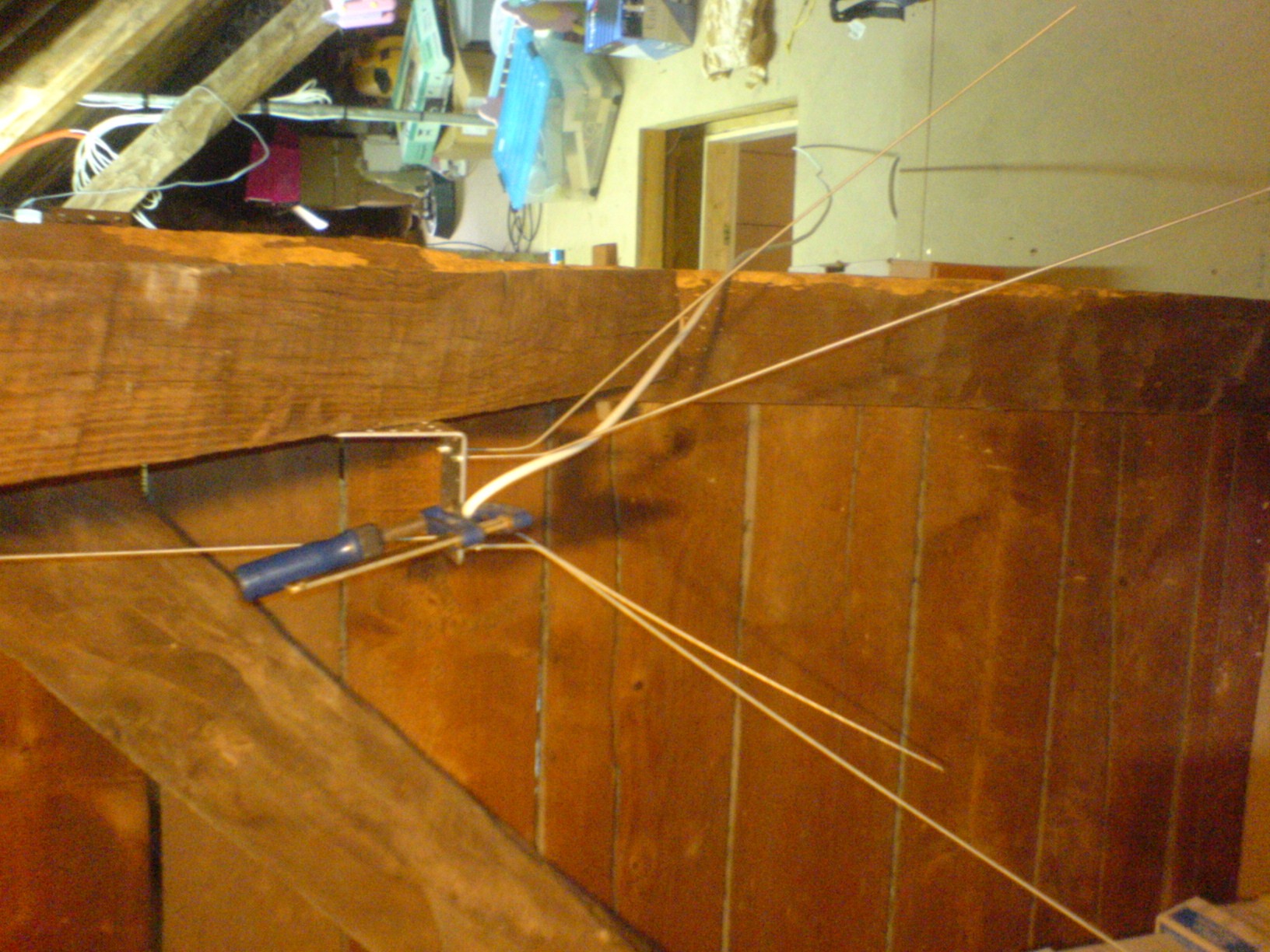 Hatte noch eine PL-PL Kupplung hier, diese also genommen Radiale um den Stecker gebogen und mit ner kurzen PL auf BNC Leitung Fixiert. Oben den Strahler kleine Öse gebogogen und mit Faden an Der Decke Fixiert dann einfach in die Kupplung gesteckt.