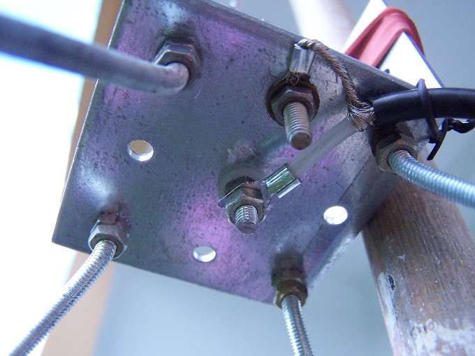 Ich hatte noch ein altes Stück durchsichtigen Benzinschlauch im Regal liegen, welcher bereits ausgehärtet war. Der Benzinschlauch hatte einen Innendurchmesser von 4 mm und passte wie angegossen auf die M4 Gewindestange. Ich habe ein Stück, etwas größer als die Stärke des Winkels, abgeschnitten und auf das Gewinde der Gewindestange gedreht, auf welche ich vorher schon zwei Muttern (eine als Konterung) geschraubt und 3 Kunststoffunterlegscheiben gelegt hatte. Der Außendurchmesser des Schlauches beträgt 7 mm. Um den Strahler stabil zu befestigen habe ich das mittlere Loch auf 6 mm aufgebohrt und den Schlauch (7 mm) beim Festziehen der Schrauben des Strahler in die Bohrung (6 mm) gequetscht. Als Isolierung zwischen den Muttern und dem Winkel habe ich, wie oben schon erwähnt, Kunststoffunterlegscheiben benutzt. Um sicher zu gehen habe ich noch einmal alles mit einem Durchgangsprüfer abgecheckt - Masse und Strahler zu 100 % voneinander isoliert!!!