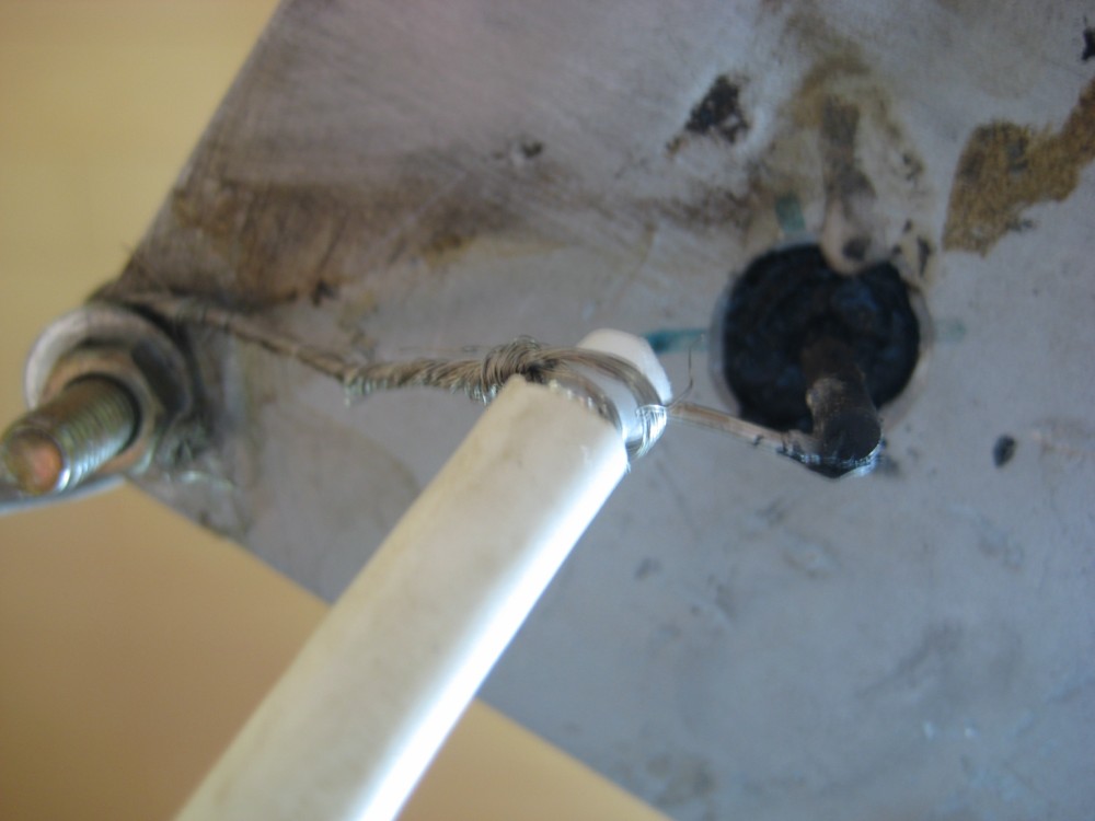 Auf jede Ecke der Aluplatte ein 5mm Loch und in die Mitte der Platte ein 12mm Loch bohren. Dann das Ende der Schweißdrähte kurz blank schmirgeln, an 4 der Drähte (welche nachher die Radials sind) eine Ösen für die M5 Schrauben biegen und die Drähte dann ablängen für die entsprechende Frequenz . Die Öse dann um 45° abbiegen und die Stäbe nach unten gerichtet auf den Ecken der Alluplatte mittels M5 Schrauben monitieren.