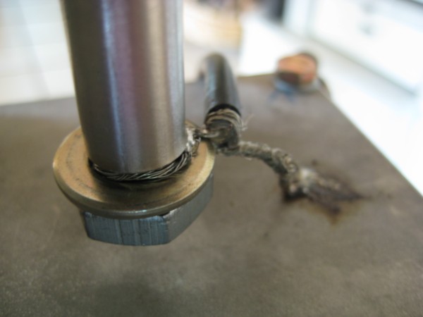 Nun durch den Holzblock mittig ein 3mm Loch bohren und den 5. Schweißdraht ca 30mm durch das Loch im Holzblock schieben ggf. mit einem Hammer kurz nachhelfen. den Holblock mit dem Schweißdraht (welcher nachher der Strahler ist) mittig auf der Aluplatte auf dem 12mm Loch festkleben.
