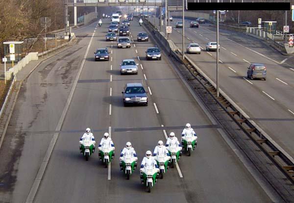 .. das macht man aus polizeitaktischen Gründen... im übrigen ist es in Berlin zum Beispiel so, das Staatsgäste in Verband fahren mit gelber und grüner Fahne am Anfang/Ende und die Straßen zusätzlich abgesperrt werden durch die Kradstaffel... weiterhin werden die LZA´s an der Route dann entsprechend abgeschalten (durch die Reglerzentrale)