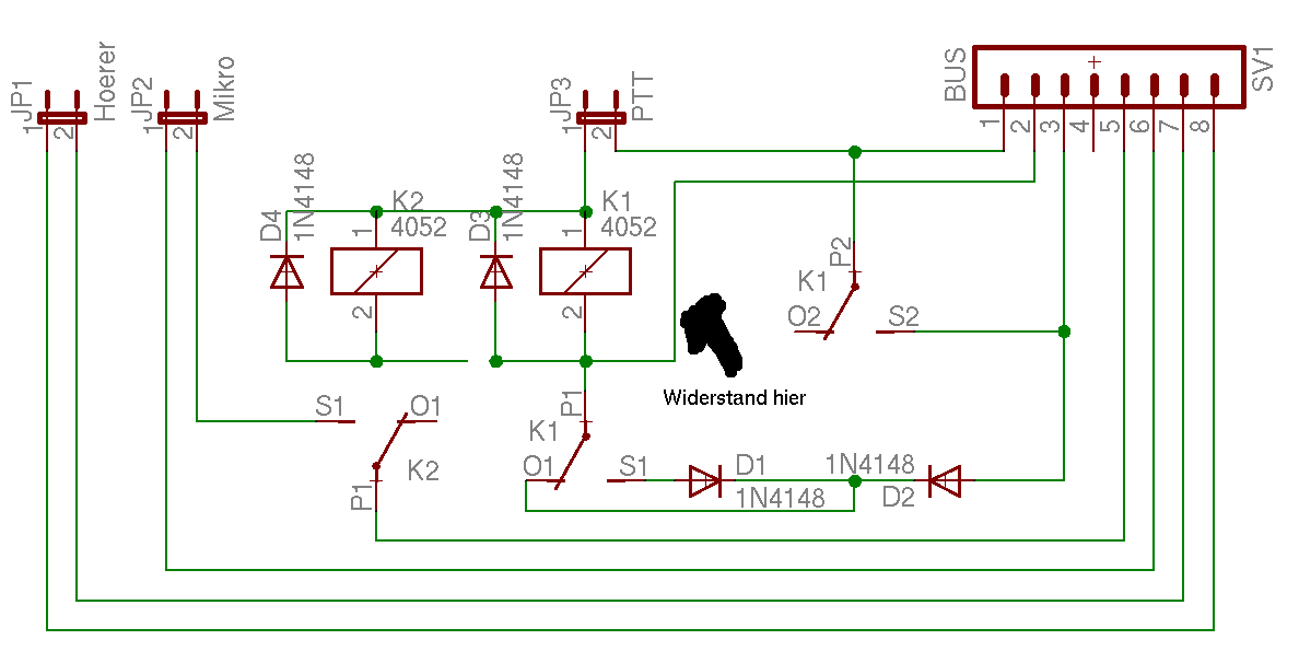 Die Hörkapseln der Höhrer kommen an den Ausgang des Verstärkers. Die Sprechtasten schalten jeweils ein Relais. Mit dem Relais wird mit einem Kontakt der Verstärker eingeschaltet, mit einem anderen wird das entprechende Mikro auf den Verstärker geschaltet.
