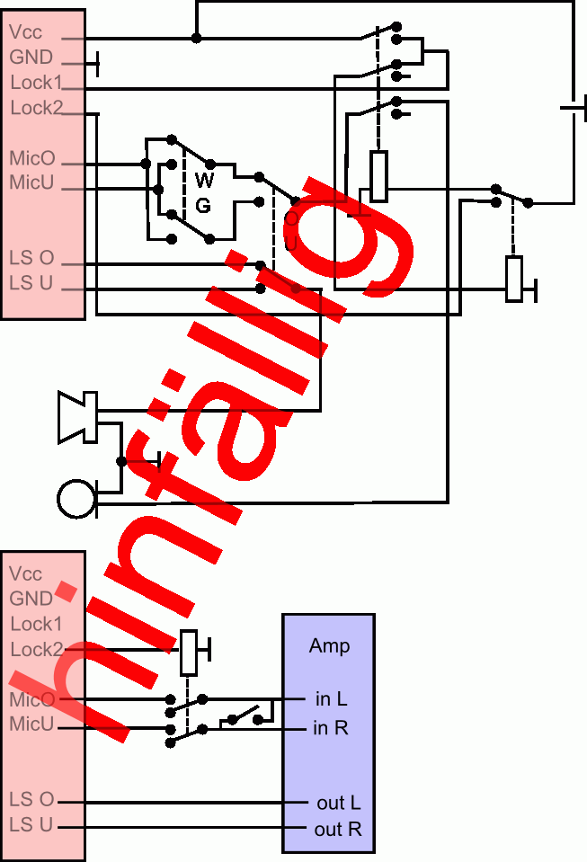 Ich habe mir daher noch ein paar Gedanken gemacht und mal eine grobe Skizze beigefügt. Diese Schaltung basiert auf der weiter oben bereits geposteten. Ich habe lediglich die Anzahl der Relais auf zwei pro "Sprechstelle" verringert. "Lock1" und "Lock2" sind geblieben. Addiert habe ich dann meine Idee, den linken und rechten Kanal eines Stereoverstärkers als Ober- bzw. Unterband zu nutzen.