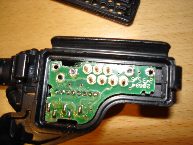 Mir ist bereits gelungen, die Abdeckung an dem Steckverbinder zu entfernen, sodass ich nun auf die kleine Leiterplatte mit den 7 Federstiften schauen kann (siehe Foto).