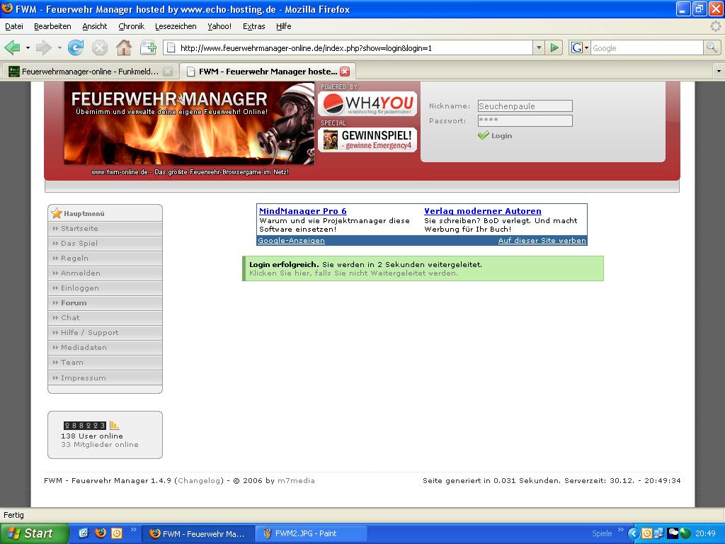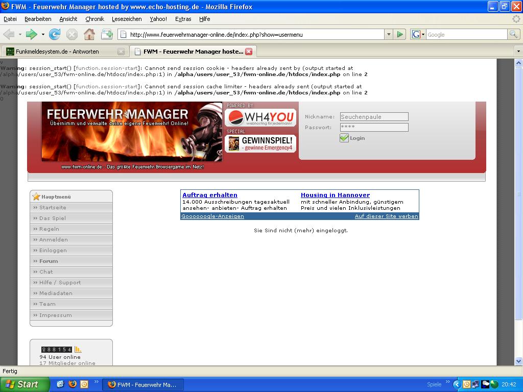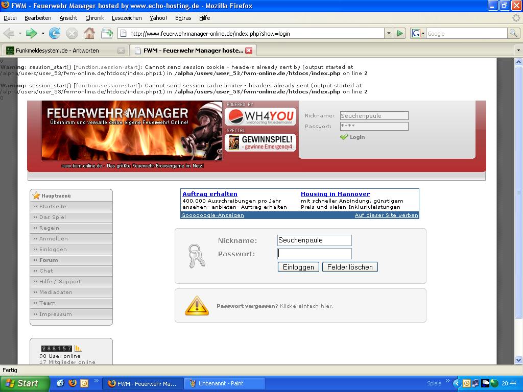 Ich habe folgendes Problem: Seit ein Paar Tagen kann ich mich bei Feuerwehr-Manager nicht mehr einloggen es wird jedesmal immer nur die haupte Startseite angezeigt... ganz oben am Bildrand steht folgende Meldung:"