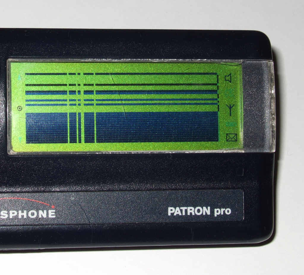 Inzwischen stellt sich bei mir der Eindruck, dass es sich nicht um ein mechanisches Problem mit dem Kontakt des Folienkabels handelt. Denn: Wenn man die Mitteilungen durchblättert, befinden sich auf der linken Displayseite ja immer die Piktogramme für die Knöpfe. Wenn man die letzte Mitteilungsseite erreicht hat, sieht man sehr wohl, wie das obere linke Piktogramm halbwegs vollständig innerhalb von etwa einer halben Sekunde aufbaut (siehe Photo). Außerdem erkennt man, dass Dots angehen, die es nicht sollten (Oberes und mittleres Piktogramm sind fälschlicherweise verbunden) und erheblich mehr vertikale Zeilen fehlen als beim letzten Bild.