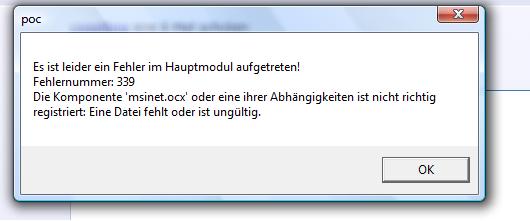 Ich bekomme auch diese Fehlermeldung auch wenn ich die MSINET.OCX heruntergeladen und in System32 kopiert habe. Könnte das an Visa liegen? Was könnte sonst falsch sein?