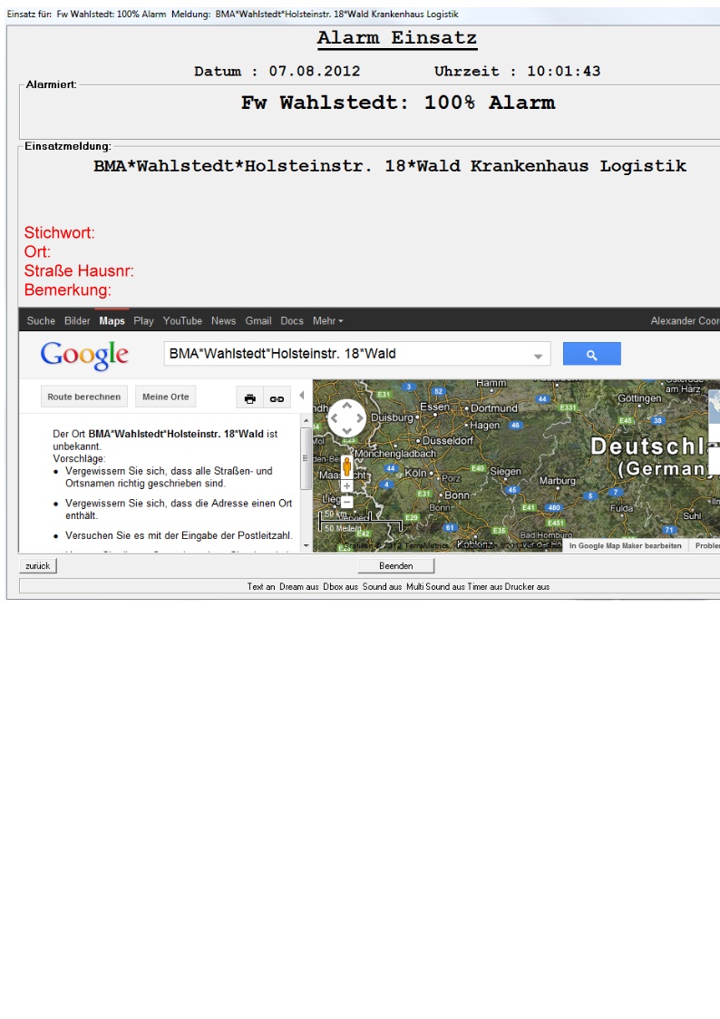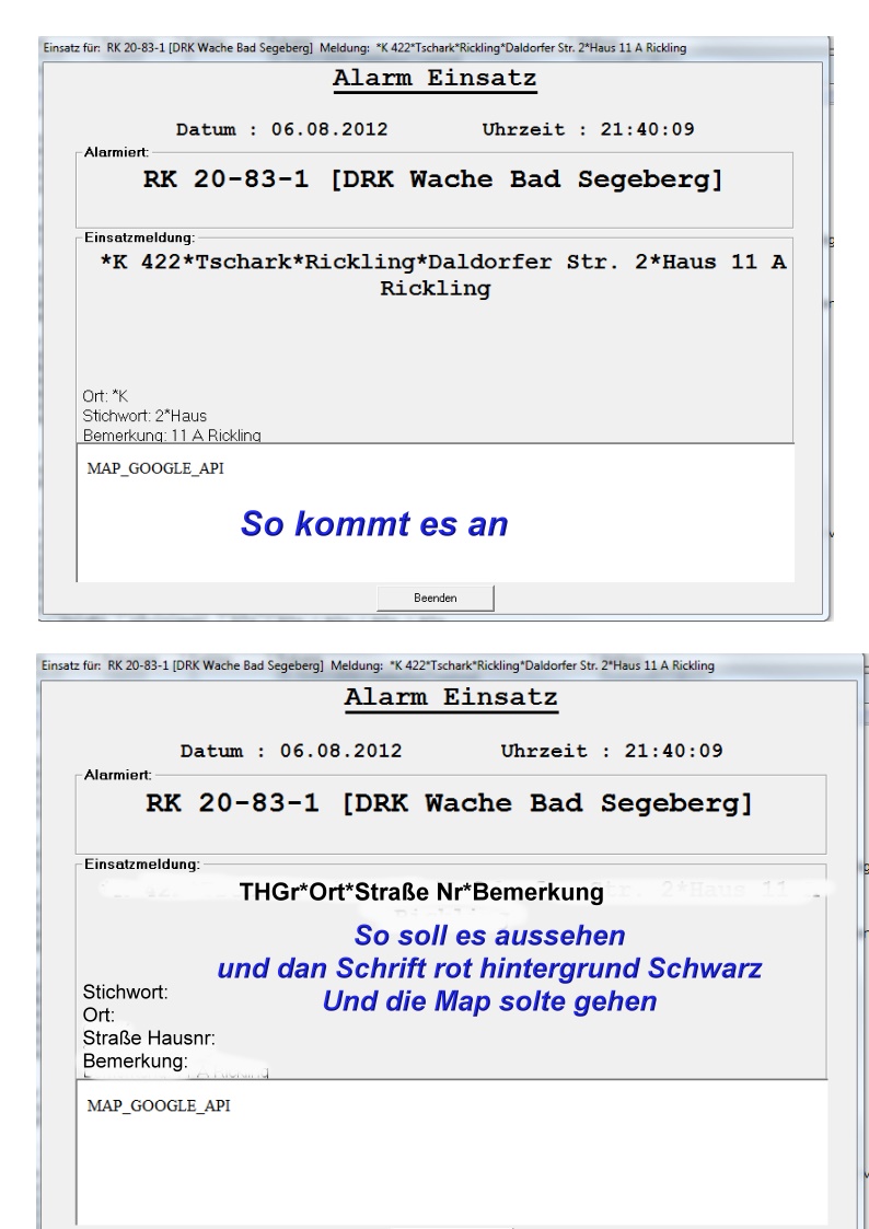 Ich bin inzwischen schon soweit gekommen das das Bild schon mahl schwarz ist und ne Map öffnet aber es fehlt mir immer noch eine Einstellung und zwar wie auf dem Bild zu sehen das rot geschriebene. und die routen berechnung fehl auch noch google übernimmt die gesamte einsatzmeldung es soll aber nur den ort und strasse übernehmen wo ist mein fehler inzwischen?