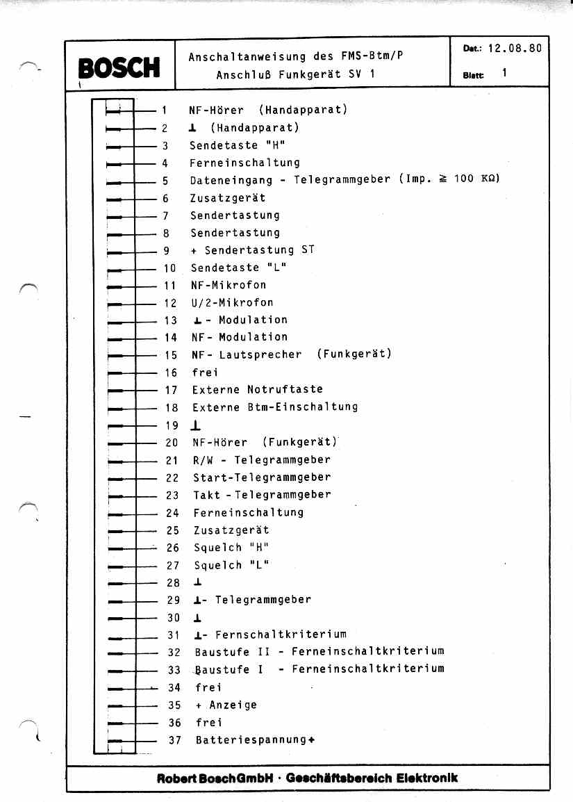 ich bin verzweifelt auf der Suche nach der Anschlußbelegung eines alten Bosch FMS-Gebers (Baujahr vermutlich 1978). Das Gerät entspricht von den Abmessungen dem AEG X4, besitzt aber auf der Rückseite nicht diese Messerkontakte, sondern hat einen 37-poligen Substecker, einen Lautsprecheranschluß und eine mir nicht bekannte Buchse. Leider stimmt die Pinbelegung auch nicht mit den Geräten von Teletron überein. Falls jemand noch Unterlagen zu diesem Gerät besitzen sollte, bin ich über jegliche Hinweise dankbar...