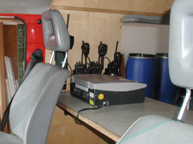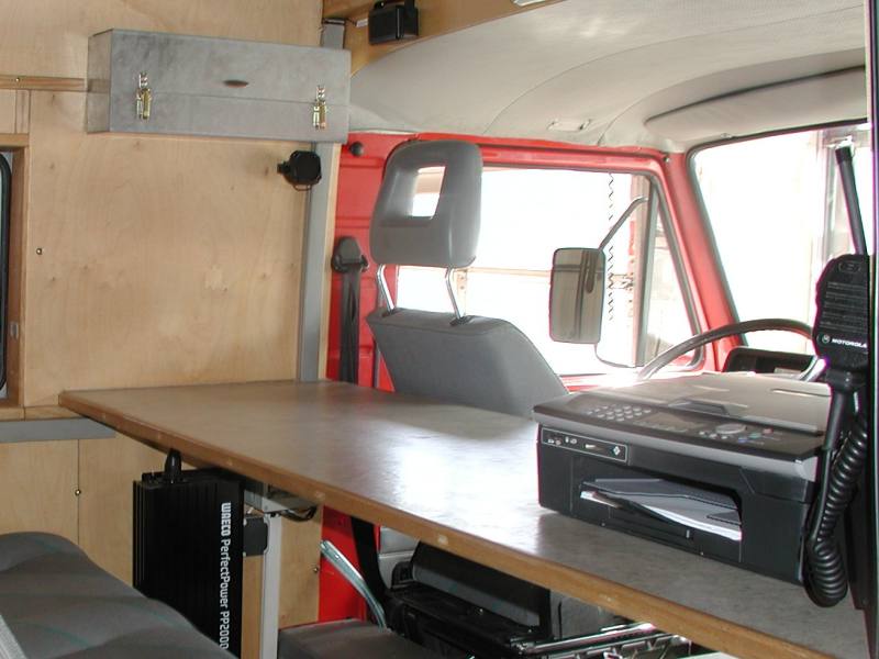 -mit dem drehbaren Stuhl vom Arbeitsplatz 1 ist der kleine Ablagetisch mit Staufach fürs 2,5 kVA Aggregat zu benutzen. Hier kann das Notebook mit Wärmebildkameraempfänger (im orangen Koffer) aufgestellt werden.