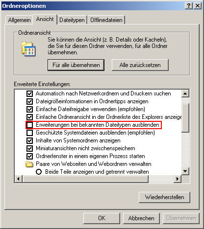 Entfern mal folgendes Häkchen in den Ordneroptionen, dann siehst Du auch die Dateiendungen der Dateien, die verknüpft sind: