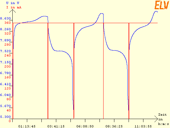 Auf dem Bild unten erkennst Du , dass beim ersten Zyklus der "Peak" noch nicht deutlich ausgeprägt ist . Bei neuen Akkus ist diese Kurve noch flacher. Beim zweiten Zyklus hingegen kann man den Peak deutlich erkennen .