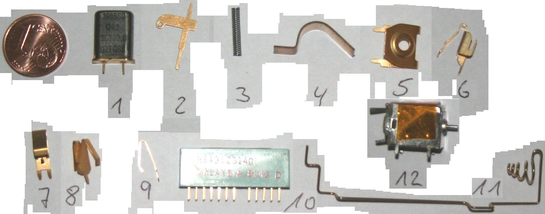 Also der Quarz hat glaub die Frequenz 168,625 wenn ich mich nicht irre! Die 11 ist ein Batteriefachbügel ;-) kommt mir irgendwie bekannt vor! Kann das von nem Swissphone Hurricane sein?? Und die 12 sieht stark nach nem Vibrationsmotor ohne Uhnwucht aus...