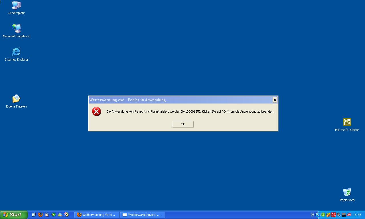 Folgendes Problem: Nach Format C: wollt ich ganz gern das Programm "Wetterwarnung Version 3" installieren. Soweit so gut. Wenn ich es nun aber starten möchte bekomme ich eine Fehlermeldung - siehe Screen -