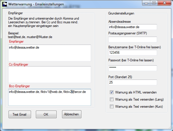 Mir fällt auf das der Postausgangserver fehlt. Warum schickst Du es über Bcc und nicht über cc Empfänger. Im Programm heißt es auch noch "Bei cc und Bcc muß mind. ein Hauptempfänger eingetragen sein" das heißt für mich das in beiden eine Adresse stehen muß. Es gibt noch eine Möglichkeit: Du holst dir bei GMX oder WEB eine Adresse trägst diese in das Programm ein und dann verteilst du die email über die GMX oder WEB Adresse das mache ich so.