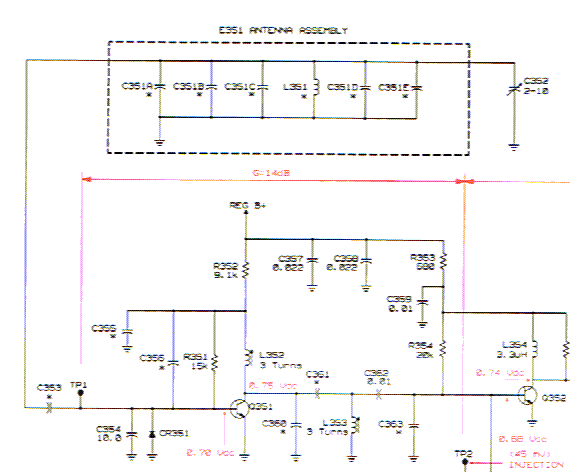 Eigentlich wollte ich C353 entfernen und das Antennensignal über einen Kondensator an TP1 einspeisen.