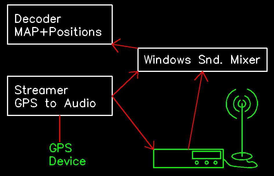 In einem Java Clienten welcher eine anbindung an eine GPS Maus hat, werden die GPS koordinaten in eine POCSAG audiospur konvertiert welche dann über das CB-funkgerät gesendet wird. Eine andere station sowie der sender haben ein decoder laufen, welcher diese audiospur entschlüsselt und auf einer karte den standort (position) anzeigt, natürlich mit Namen zur indentifizierung.