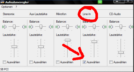 Dann schraub mal den Aufnahme-Regler für den "LINE IN" ganz hoch...