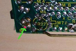 Ach ja, das Bild: Da wo der rote Punkt ist, ist eine kleines Loch in der Platine, umgeben von zwei halbmondförmigen Lötpads. Das ist die Lötbrücke, einfach einen Tropfen Lötzinn drauf und fertig.