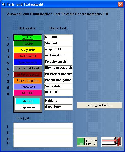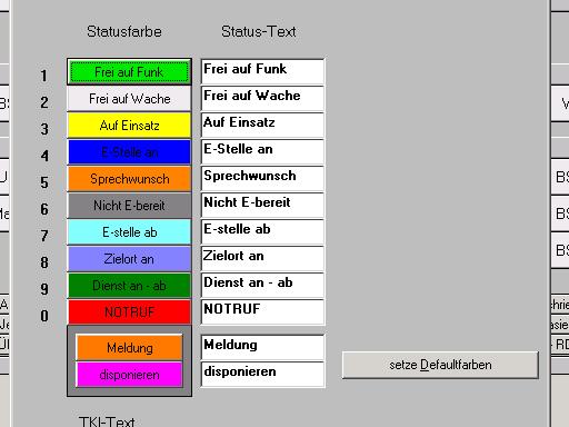 Die Aufteilung soll so sein, alle grüntöne bedeuten freie Einsatzkräfte. Alle rot und gelbtöne bedeuten eine Einsatzaktivität und blau für Informationen. Ausnahme bildet der Notruf, er soll ja Optisch besonders hervorgehoben werden!