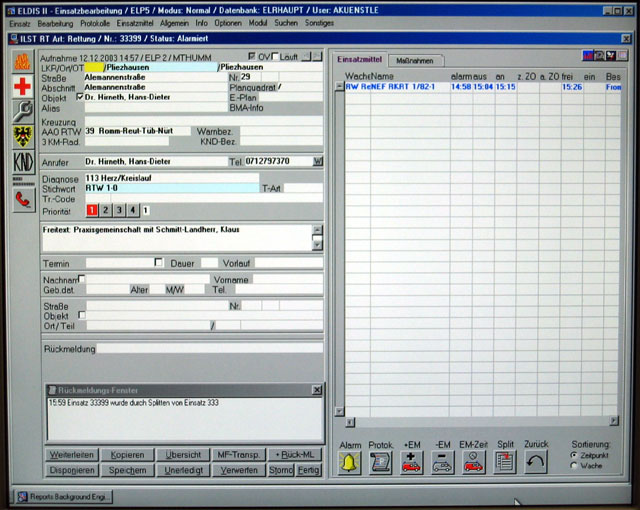 ja guter Vorschlag aber wobei bei ELDIS wieder zuviele Information hat, die man wirklich in der Leitstelle nicht unbedingt braucht.. ich weiß auch das viele Leitstelle mit ELTIS von der Fa. Kappacher arbeiten wobei das ich das System der Fa. Wesser jetzt Fa. Swissphone vorziehe aus dieser Einsatzmaske habe ich auch die für mich ersichtlichen relevanten Felder heraus genommen und sie zusammen gestellt !
