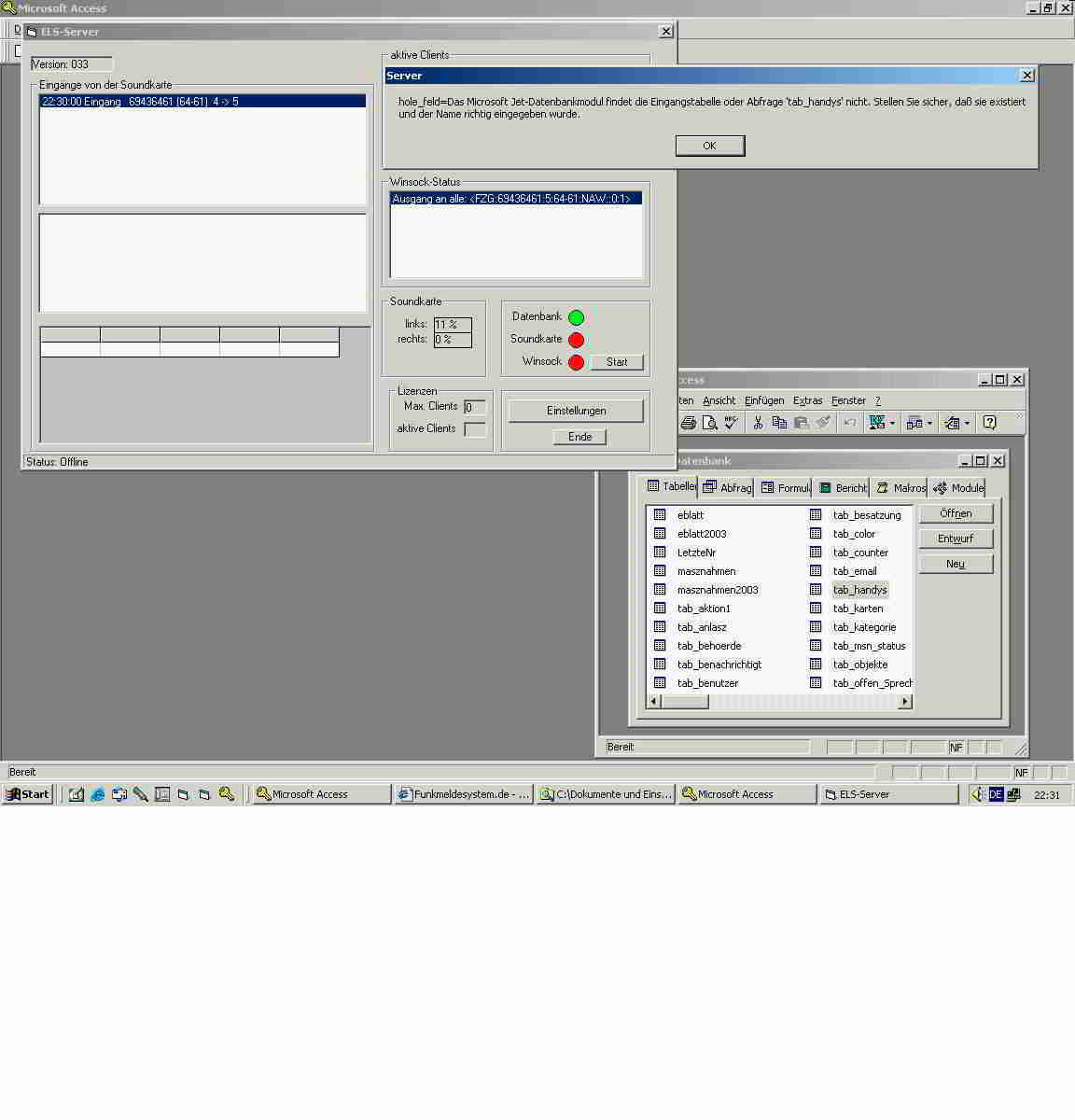 jetzt habe ich nach Update auf 033a und alleinigem Start von ELS ohne den Server trotzdem eine Fehlermeldung beim Nachstarten des Servers wegen einer fehlenden Tabelle "tab_handys". Die Tabelle ist aber da, in MS Access kann ich die Tabelle in der Datenbank sehen.