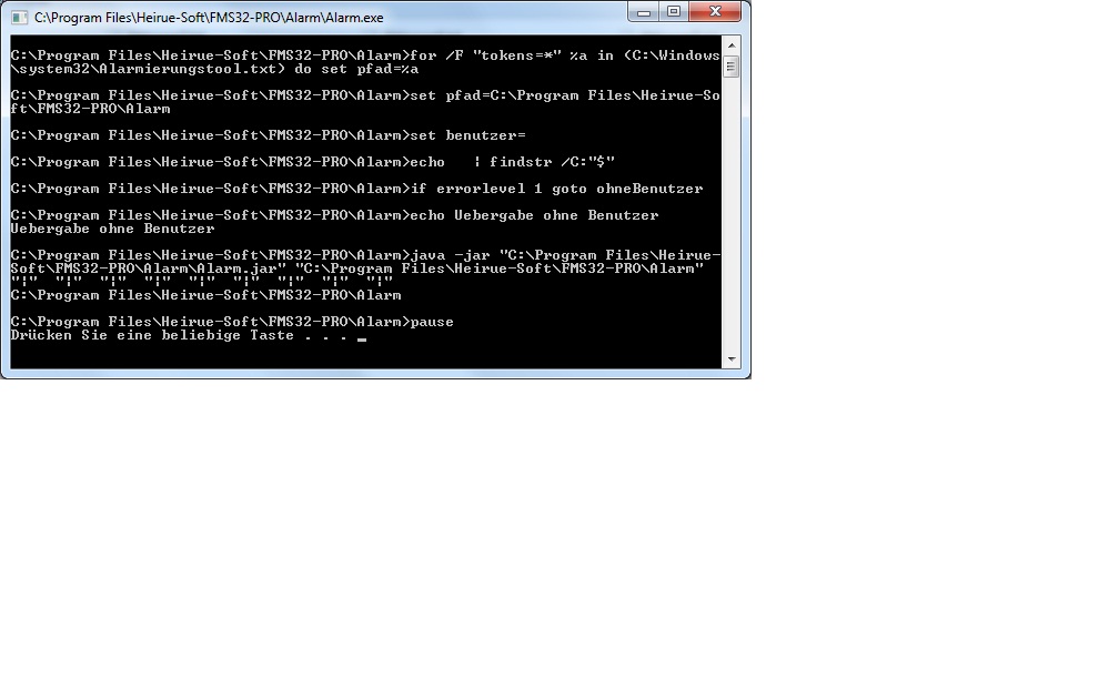 Wenn dann die Alarm.exe via FMS32 ausgeführt wird, wird durch verschiedene Batch-Befehle die Alarmierungstool.txt geöffnet, der Pfad als Variable gespeichert und an den Befehl "java -jar Alarm.jar" vorne hingehängt.