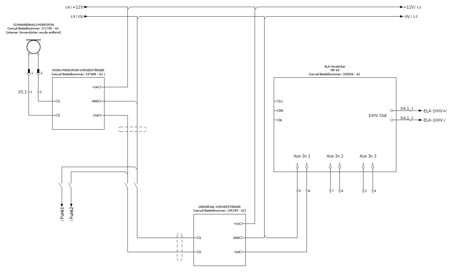 Der Mikrofon-Vorverstärker liefert mir ca. 5 mV. Dieses Signal geht auf verschiedene Funkgeräte und die ELA. Vor der ELA habe ich nun noch einen Universal-Vorverstärker eingebaut, um das Signal auf 300mV zu bekommen.