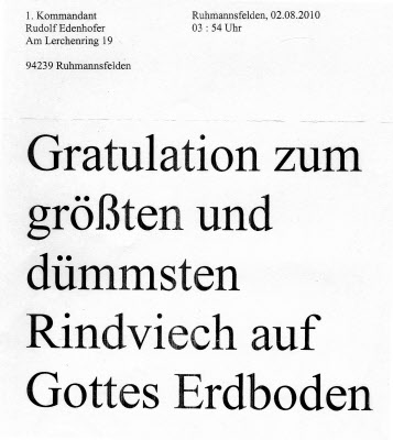 Zumindest ein Mitbürger/eine Mitbürgerin – wahrscheinlich aus dem engeren Bereich des Marktes Ruhmannsfelden – sieht das völlig anders und hat die Wut über die nächtliche Ruhestörung in mehreren anonymen Schreiben zum Ausdruck gebracht. So lag in der Privatpost von Kommandant Rudi Edenhofer am Dienstagvormittag ein Brief mit folgendem Text: „Gratulation zum dümmsten Rindvieh auf Gottes Erdboden“. Vermerkt ist unter dem Datum 2.8.2010 auch noch die Uhrzeit 3.45 Uhr, was wohl besagen soll, dass der Briefschreiber zu dieser Zeit durch das Martinshorn aufgeschreckt wurde.