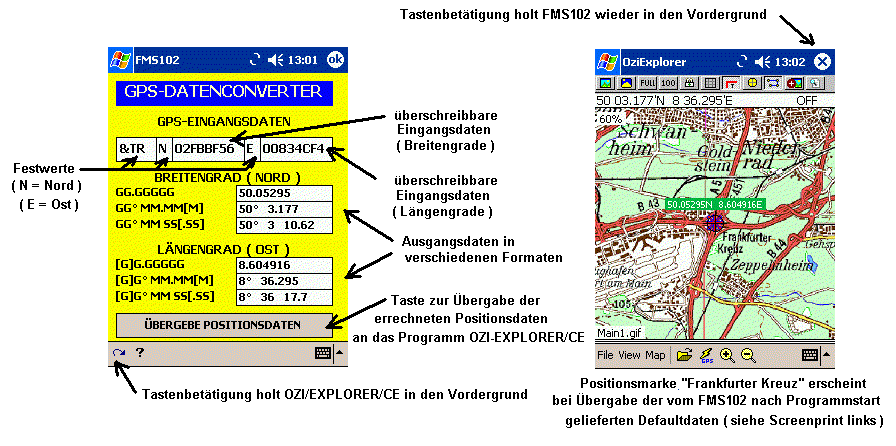 Zur Auswertung dieser Protokolle habe ich ein kleines PDA-Tool geschrieben. Es gestattet die Tastatureingabe der in obigem Protokoll enthaltenen 2x8 Hexwerte und rechnet diese Daten in Längen- und Breitengradwerte um, wobei die Ergebnisse in verschiedenen Formaten ( sie Abb. ) auf dem Display dargestellt werden. Darüberhinaus lassen sich die errechneten Positionswerte bei Bedarf auch noch an das Kartenprogramm "OziExplorerCE" übergeben und können hier angezeigt werden.