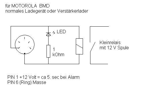 Die Motorola Lader liefern hingegen an zwei PINs für etwa 5 Sekunden 12 Volt, etwa 100 mA. Damit ließe sich ein kleines Relais schalten welches dann einen potentialfreien Kontakt darstellt. (Ich habe meine Garagentorsteuerung so gebaut)